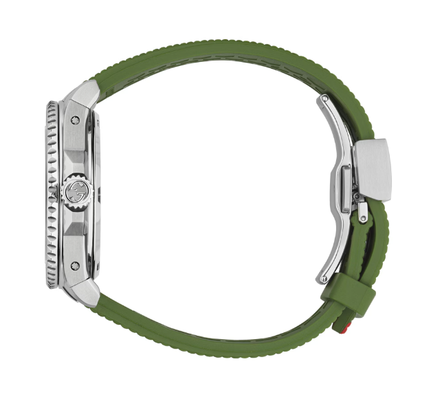Die Gucci Dive L Automatic ist ein markanter Zeitmesser mit sportlicher Attitüde und ikonischem Design. Das graue Zifferblatt wird von kräftigen Leuchtindizes und Zeigern ergänzt – perfekt ablesbar unter allen Bedingungen. Die drehbare Lünette in grau verleiht der Uhr ihren unverwechselbaren Charakter.