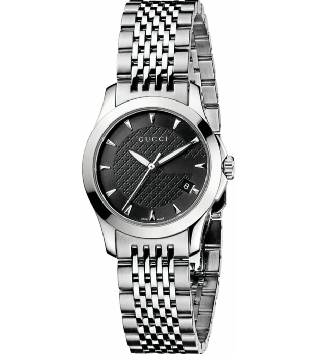 Die Gucci G-Timeless S in Schwarz ist ein Ausdruck moderner Eleganz in kompakter Form. Mit einem 27 mm Edelstahlgehäuse und einem tief schwarzen Zifferblatt mit dem ikonischen Gucci-Schiftzug bei 12 Uhr vereint diese Uhr klassisches Design mit modischem Understatement.