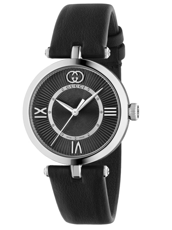 Das schwarze Lederarmband ist nahtlos integriert und betont den puristischen Charakter dieses Designs. Das dezente Gucci-Logo bei 12 Uhr und das Swiss Made Quarzwerk im Inneren stehen für Luxus und Präzision. Saphirglas schützt zuverlässig vor Kratzern und sorgt für klare Sicht auf das Zifferblatt.