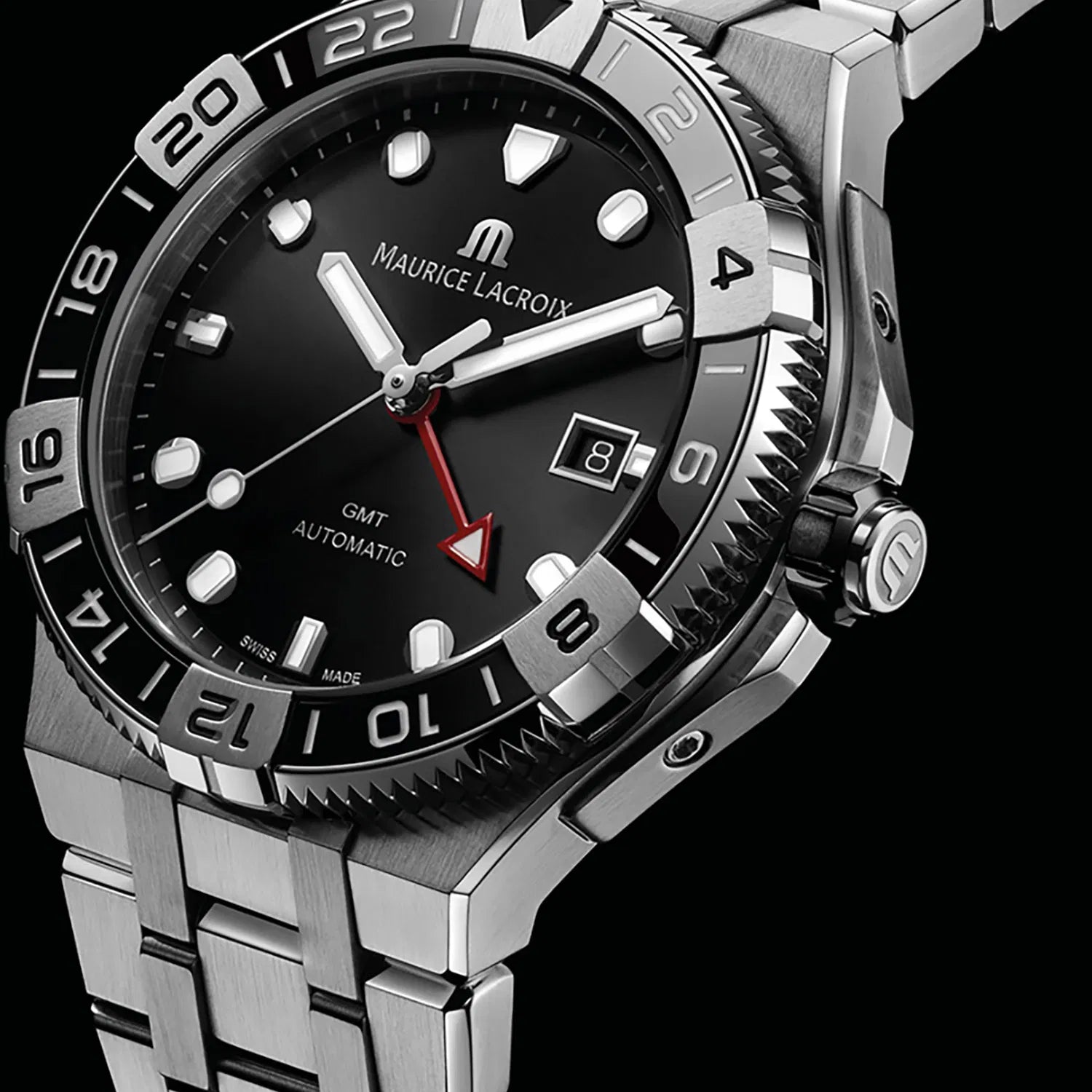 Die Maurice Lacroix AIKON Venturer kombiniert robuste Bauweise mit funktionaler Vielseitigkeit. Das schwarze Sunray-Zifferblatt bietet in Kombination mit der keramischen 24-Stunden-Lünette eine hervorragende Ablesbarkeit, während der rote GMT-Zeiger eine zweite Zeitzone anzeigt. Mit einer Wasserdichtigkeit von bis zu 300 Metern eignet sich diese Uhr sowohl für den Alltag als auch für sportliche Aktivitäten. Das Edelstahlarmband mit EasyChange-System ermöglicht einen schnellen Wechsel zu anderen Bändern, um den Look der Uhr individuell anzupassen.